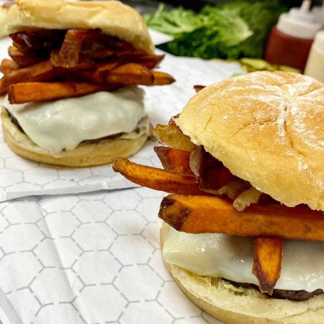Beef burger with Mozzarella cheese, crispy bacon, and topped with delicious, sweet potato fries & BBQ sauce.